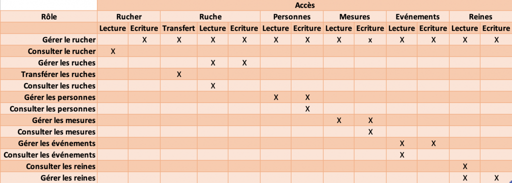 - Le rôle Gérer le rucher est assigné par défaut au créateur d’un rucher. Ce rôle correspond à un rôle d’administration ayant donc le maximum de droits. Ce rôle ne peut être assigné qu’à une seule personne par rucher.